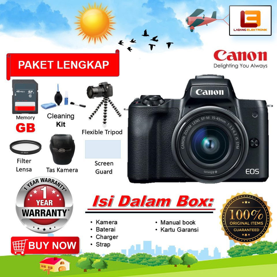 canon eos m50 kit 15 45 mm kamera mirrorless canon paket lengkap
