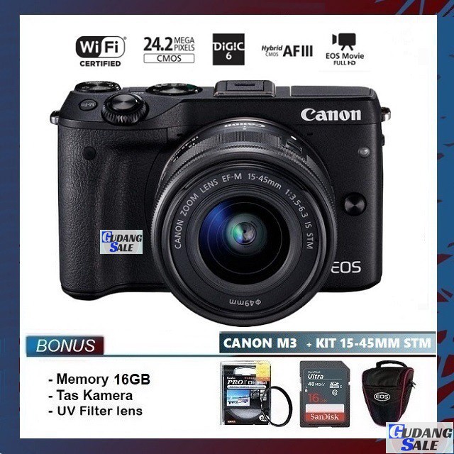 new kamera canon eos m3 lensa kit 15 45mm is stm wifi garansi 1 tahun camera mirrorless m100