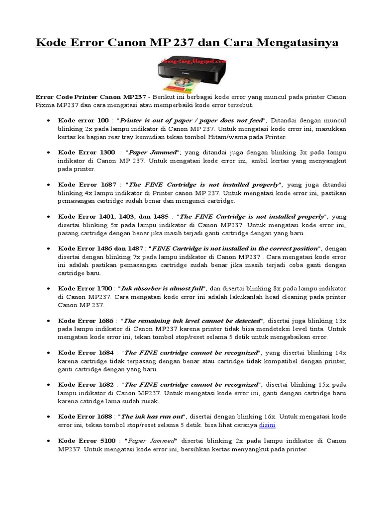 kode error printer canon mp287 dan cara