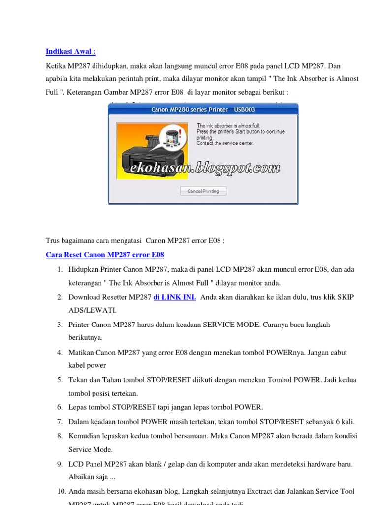 reset printer canon mp287 yang error e08