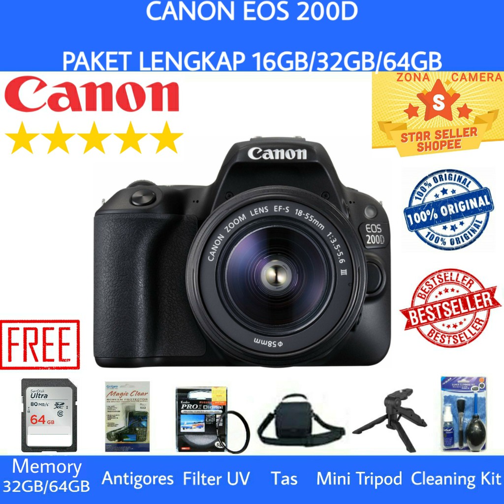 canon eos 200d kit 18 55mm is stm 24 2mp dslr bonus memory 16gb fhd