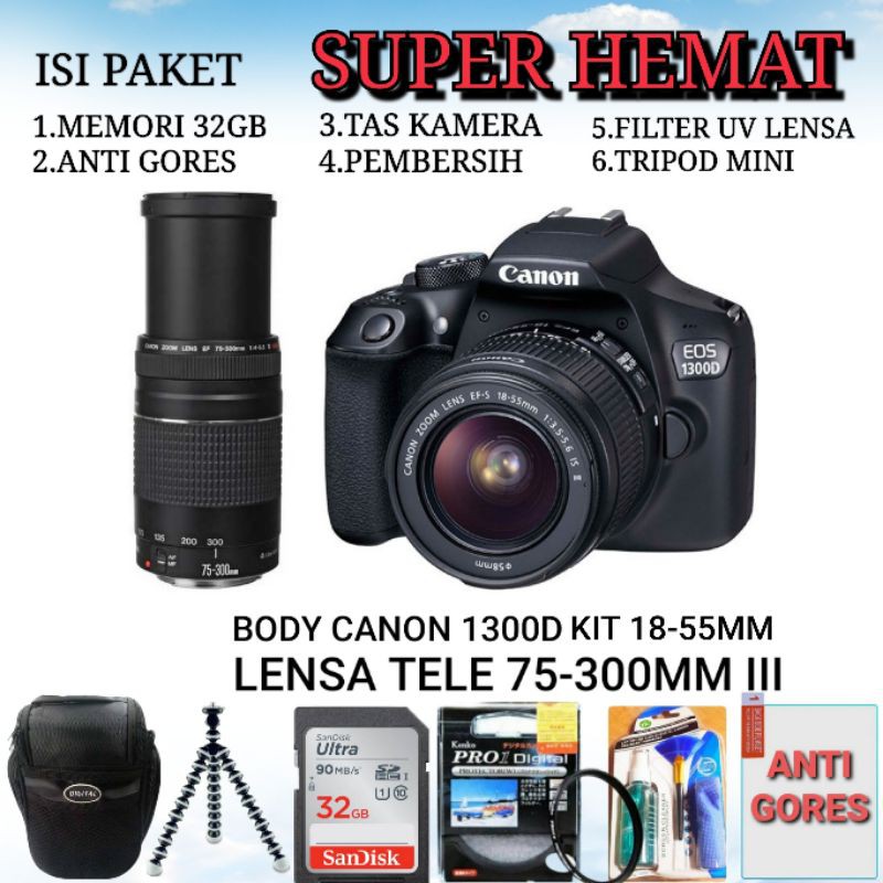 dslr canon eos 600d 18 55 fullset lensa kit tele 75 300 usm 3