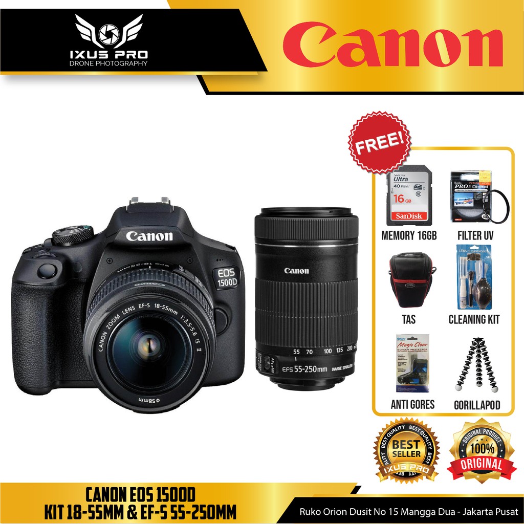 canon eos 1500d kit 18 55 is ii 55 250mm lens kamera dslr hitam free sdhc 16gb mini folding screenguard