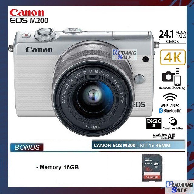canon eos m200 kit 15 45mm paket komplit 16gb