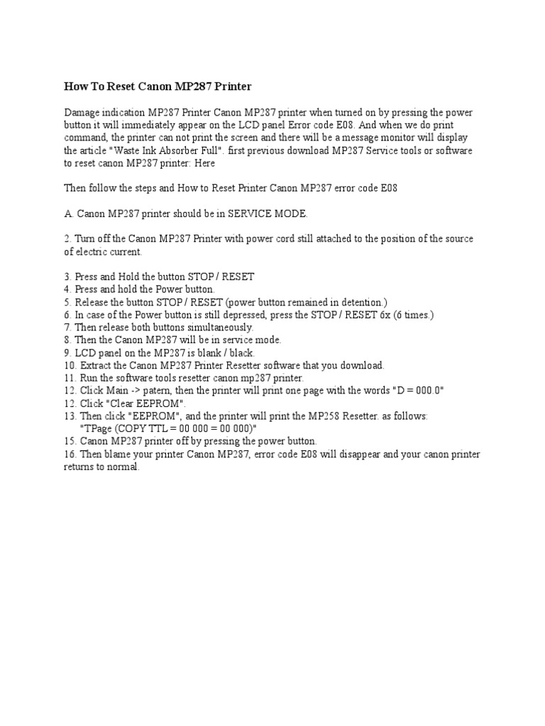 how to reset canon mp287 printer