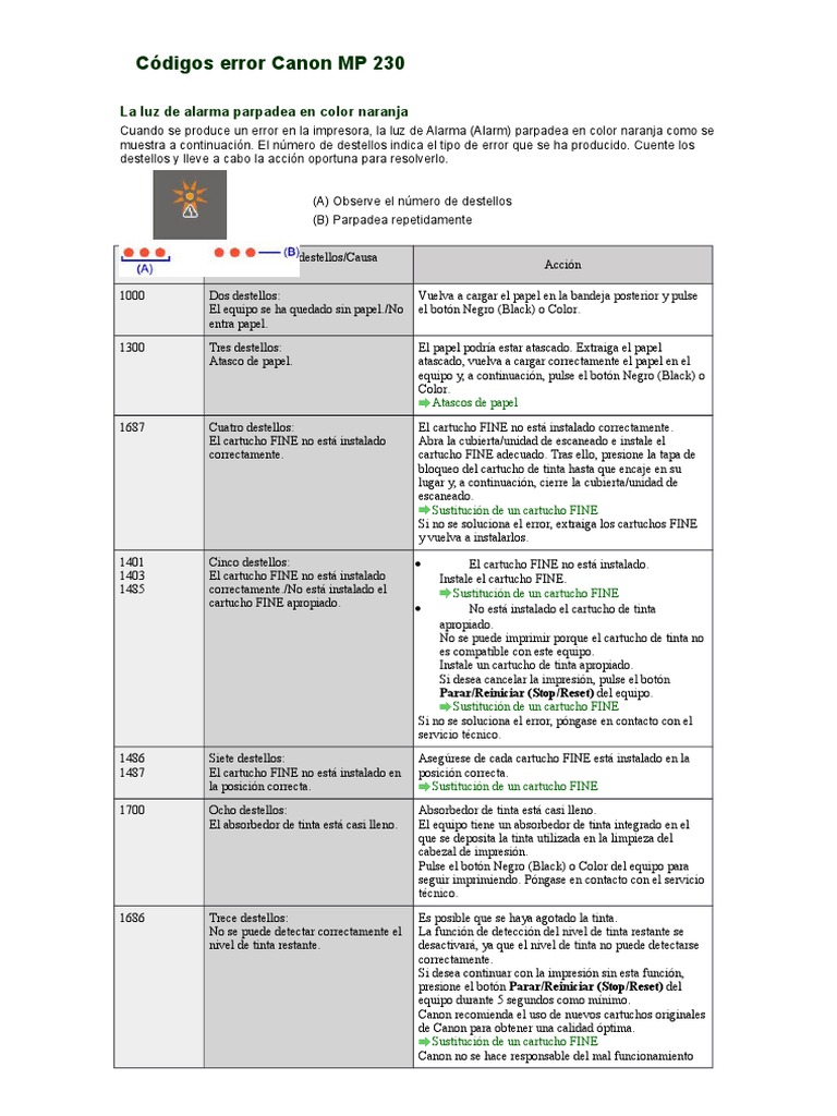 codigo error canon mp230 tinta