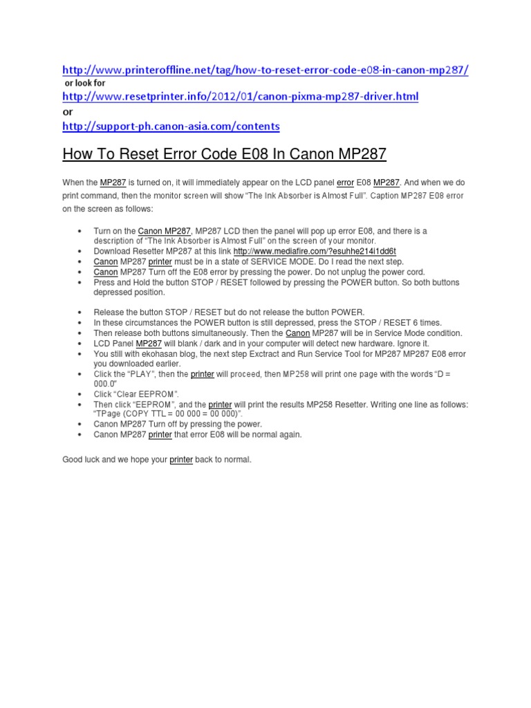 how to reset canon mp287 printer