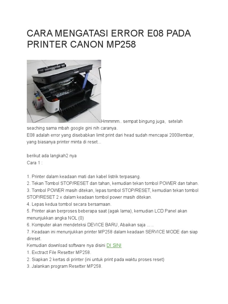cara mengatasi error e08 pada printer canon mp258 the ink absorber is almost full