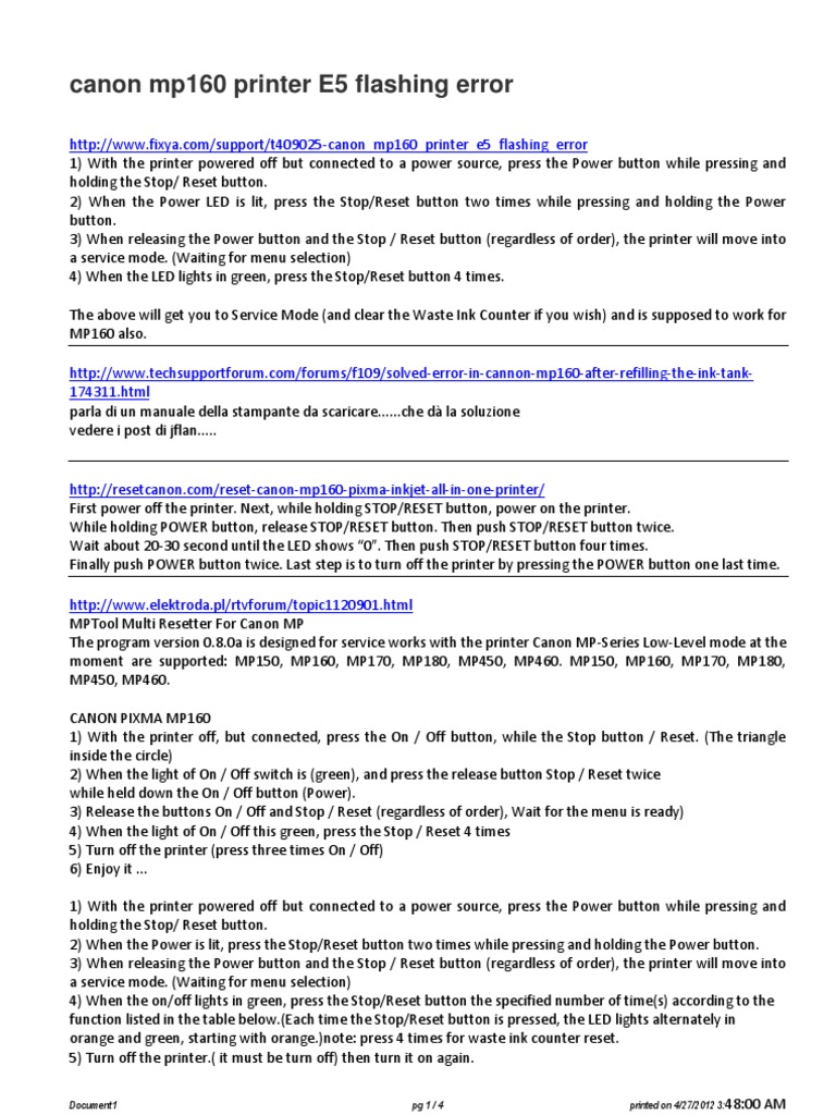 reset cartridge error e5 canon pixma