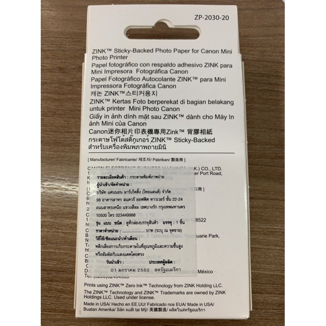กระดาษฟ ล ม printer canon zink zp 2030 1กล อง 20แผ น 2x3 paper for canon inspic s zv 123a cv 123a pv 123 pv 123a